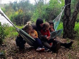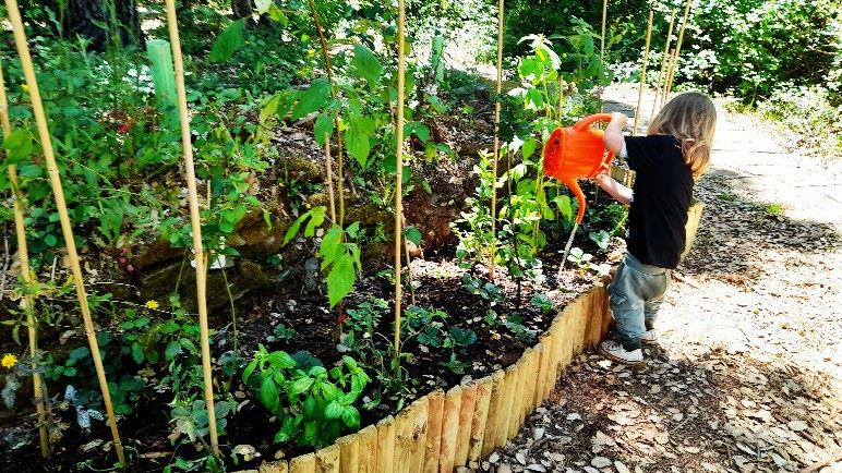 We also aim to have a small support kitchen for meals and a wood shelter for garden tools. What we have now already is: Our compost station where we deposit all the peels of fruit and leftover food, to then be able to feed our vegetable garden; a vegetable garden, that the children help to take care of; a spiral garden with fruit trees and aromatic herbs; and a flowerbed created with children where we have raspberries, blackberries, blueberries, currants, tomatoes, and physalis; hammocks where children can relax, rest or read stories; a meal and activities table where we paint and do the more artistic works; an evolutionary obstacle course that awakens the challenge in children; swings that help with balance and teach them to position the body in space; and a mud kitchen where there are no limits to children’s cuisine creativity!