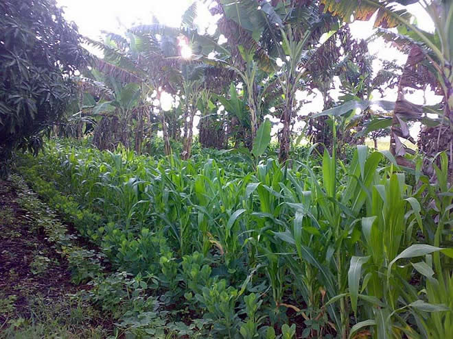 Mango tree, banana trees, corn and beans at the Ananda Vasundhara Master Unit, story here